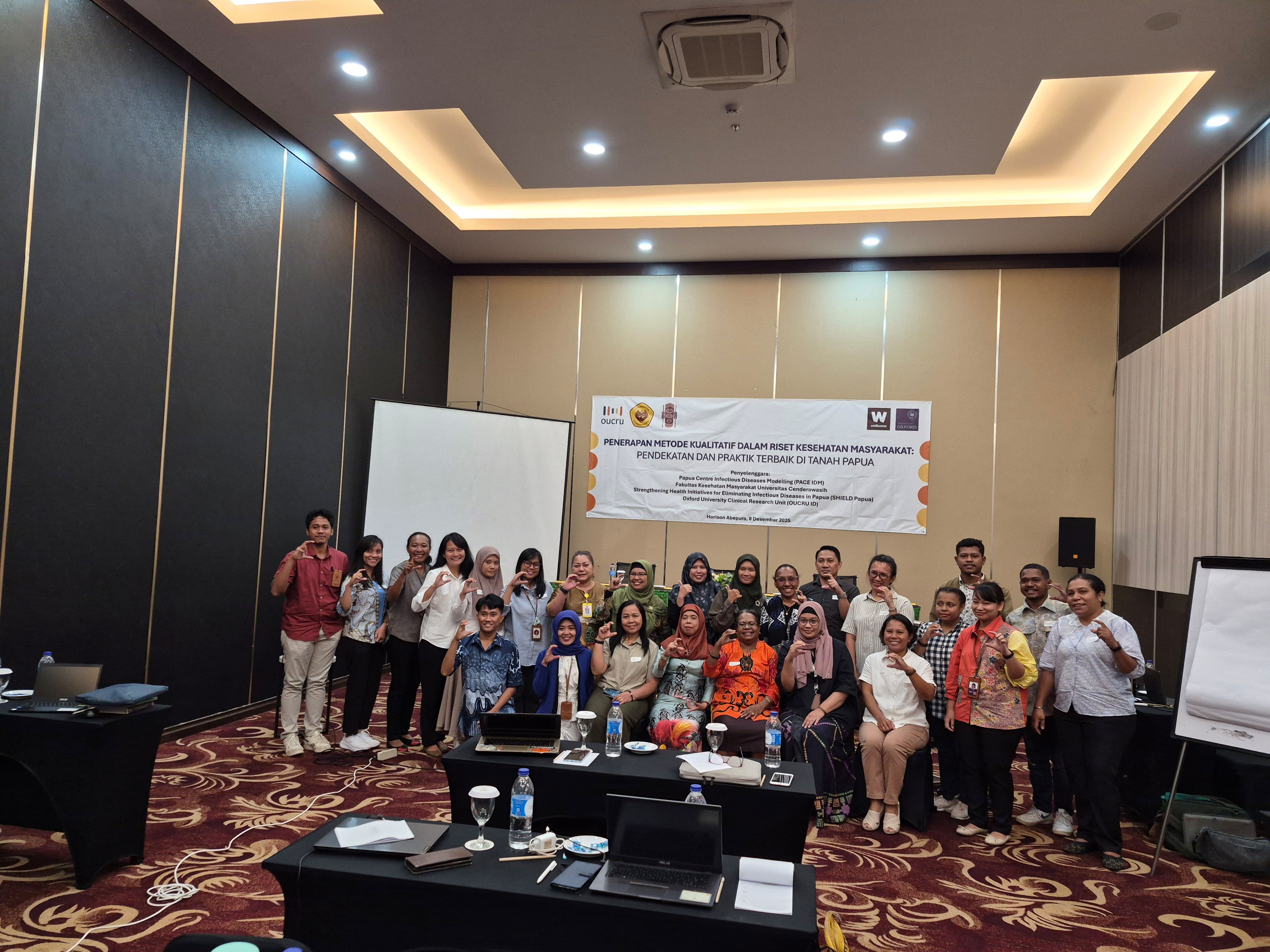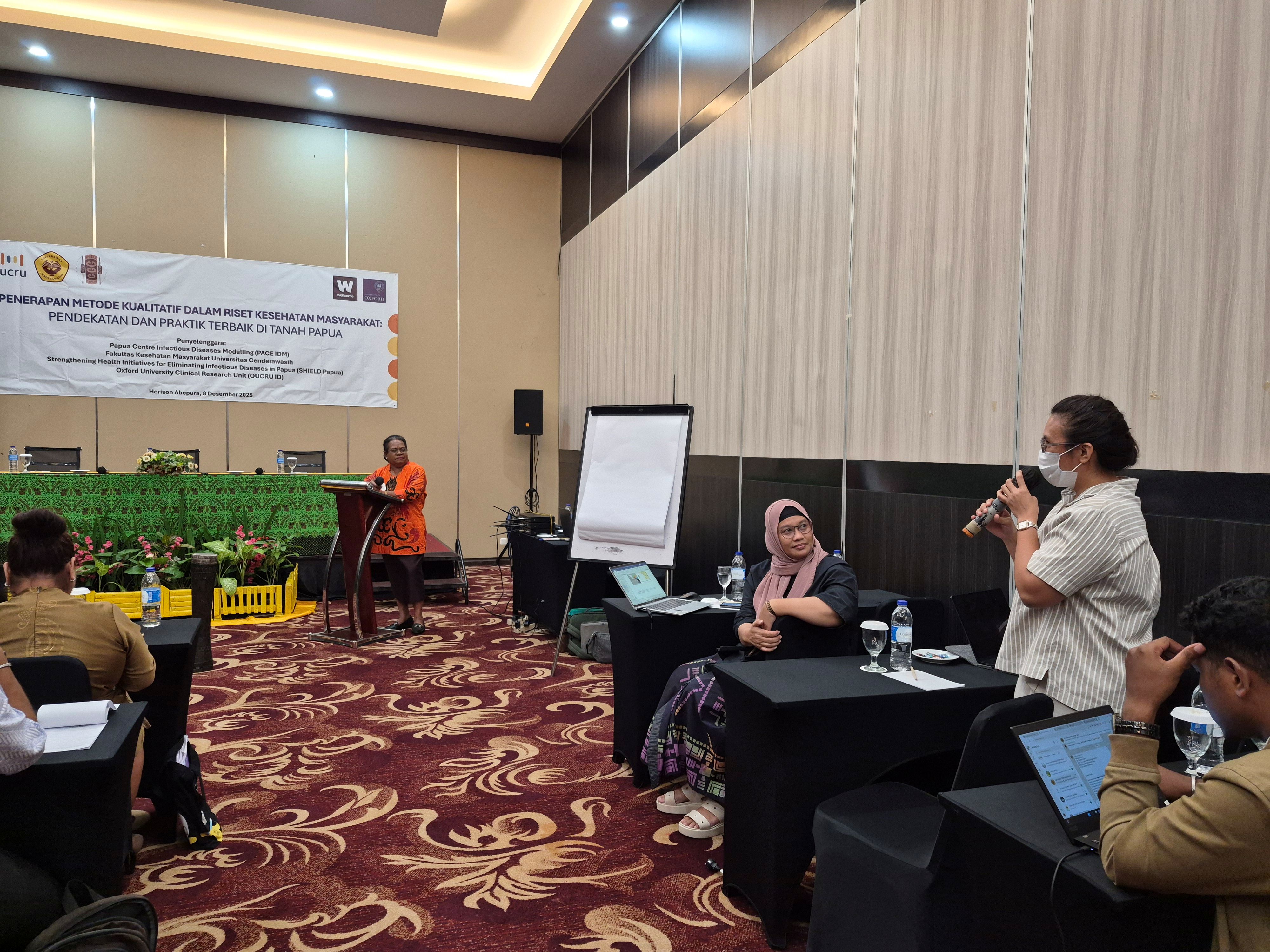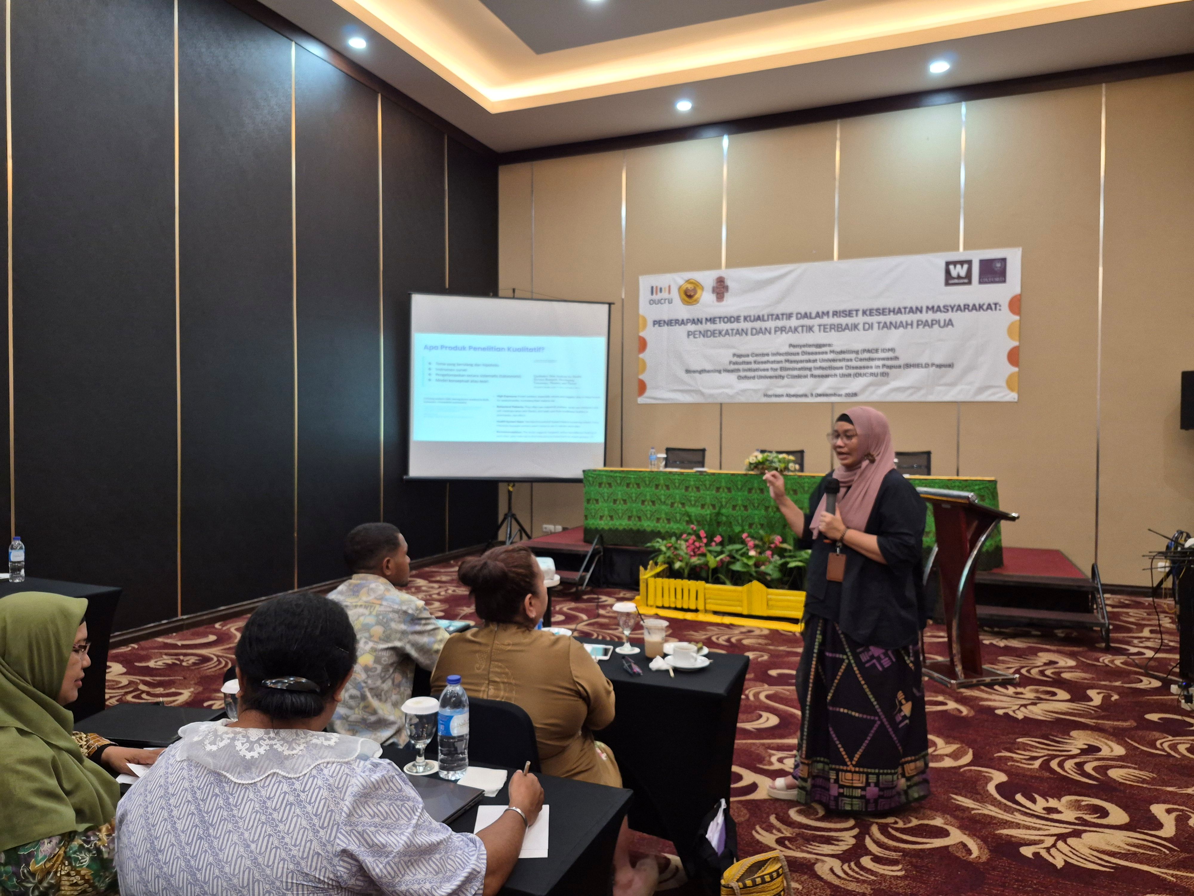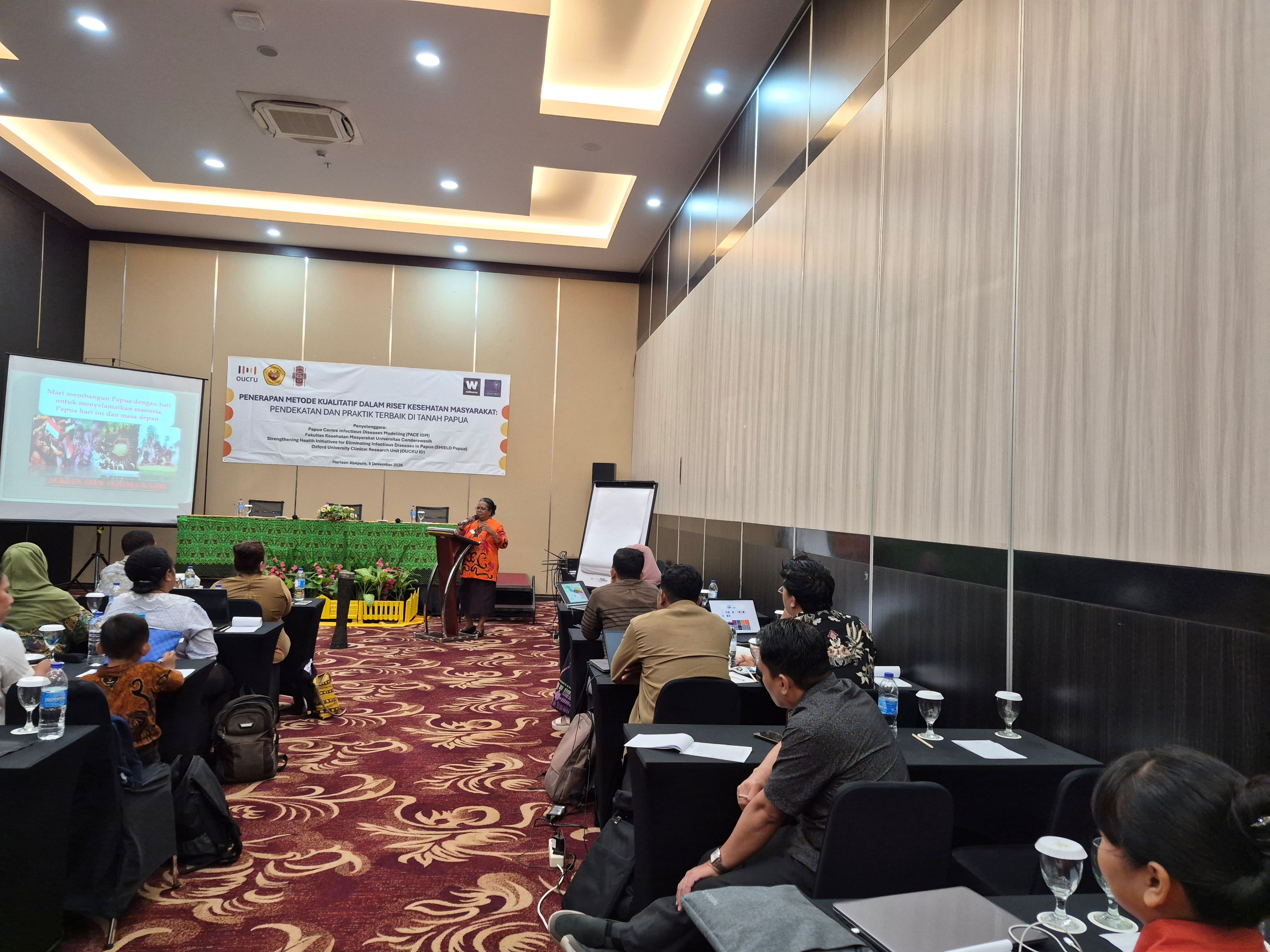A workshop titled “Application of Qualitative Methods in Public Health Research: Approaches and Best Practices in Papua” was successfully held on Monday, December 8, 2025, at the Hotel Horison Abepura, Jayapura. This activity is part of the Strengthening Health Initiatives for Eliminating Infectious Diseases in Papua (SHIELD Papua) initiative, a collaboration between OUCRU Indonesia, PACE IDM, and the Faculty of Public Health (FKM) at Cenderawasih University. The training was attended by lecturers, researchers, and students from FKM UNCEN and other related health institutions.